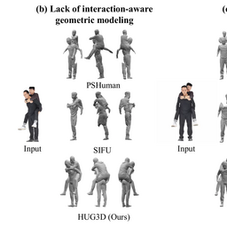 HUG3D reconstructs physically plausible, high-fidelity textured 3D humans from a single image, while handling perspective distortion, occlusion, and inter-human interactions.